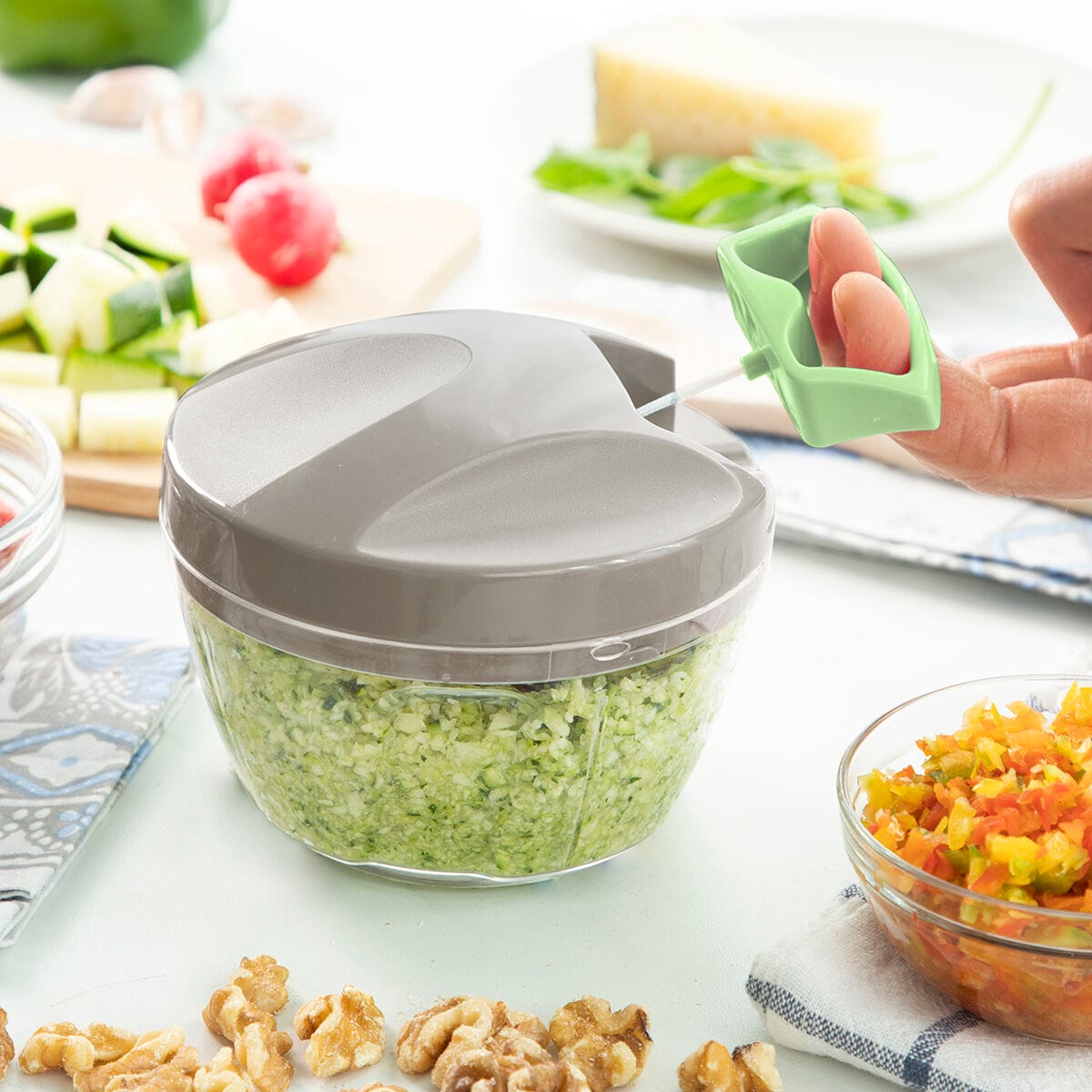 Un originale e pratico tritatutto, molto semplice da usare, che permette di tritare gli alimenti tramite un semplice meccanismo manuale con corda. Basta semplicemente mantenere il tritatutto con una mano e con l'altra tirare varie volte dal manico collegato alla corda che si trova sul coperchio, fino a raggiungere il livello di tritatura desiderato; il risultato ottenuto (pezzi pià grandi o piccoli) dipenderà dalla quantità di volte che si tira la corda. Le sue lame affilate e curve, tritano in modo efficace un'infinità di alimenti. Dispone anche di un accessorio per mescolare che serve per emulsionare salse, mescolare ingredienti, sbattere le uova, ecc. Inoltre, include un coperchio extra per chiudere il recipiente-contenitore che permette di conservare gli alimenti tritati. Grazie al suo design compatto, occupa pochissimo spazio e si smonta e pulisce facilmente.