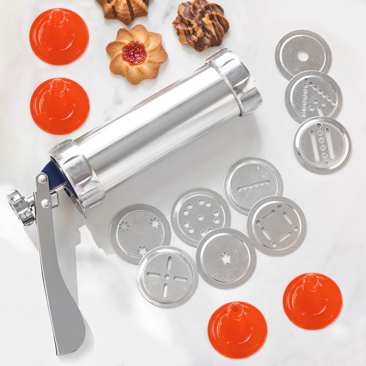 Una macchina per fare i biscotti che può essere usata anche come sac à poche, risparmiando tempo, fatica e spazio in cucina grazie al suo design multifunzionale 2 in 1. È un utensile da forno manuale molto facile da usare che permette di preparare deliziosi e originali biscotti con ingredienti naturali a casa e in famiglia. Ideale per bambini e adulti per divertirsi a sviluppare tutta la loro creatività culinaria e godersi l'esperienza di fare e decorare i propri biscotti in famiglia, contribuendo anche a una dieta più sana e salutare. Questa pistola e sac à poche multiuso con impugnatura ergonomica ha una forma cilindrica ed è adatta per impasto per biscotti, panna, cioccolato, crema, ecc. Ha 20 modelli per fare biscotti in diverse forme e 4 punte per varie decorazioni di biscotti, torte, crostate, ecc. È anche facile da smontare per la pulizia. Include istruzioni per l'uso e una ricetta di base per l'impasto dei biscotti.
