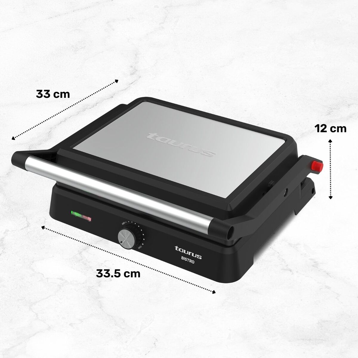 Il grill a contatto Taurus è una piastra da cucina progettata per offrire una superficie di cottura ampia e versatile, con dimensioni di 290 x 230 mm che permettono di preparare una vasta gamma di alimenti in modo efficiente. Il suo formato compatto e funzionale lo rende ideale per uso domestico o spazi ridotti, facilitando la cottura di carni, verdure e panini con un contatto diretto che garantisce un riscaldamento uniforme e risultati rapidi. La piastra assicura una distribuzione omogenea del calore, favorendo una cottura precisa e controllata, oltre a facilitare la pulizia grazie alla sua superficie liscia. Questo modello unisce semplicità e praticità, adattandosi a diversi stili culinari offrendo un metodo di cottura salutare che richiede poco o nessun grasso aggiuntivo. Il grill a contatto Taurus rappresenta una soluzione pratica per chi cerca di ottimizzare spazio e tempo in cucina senza rinunciare a una preparazione efficiente e con finitura professionale.