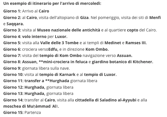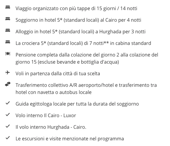 I pacchetti sono composti da voli a/r con partenza da vari aeroporti italiani con bagaglio in stiva, transfer aeroportuale e assistenza, tutti i transfer tra le varie mete, più il soggiorno di 14 notti in totale con PENSIONE COMPLETA in bellissimi hotel 5 stelle tra Giza (Cairo), Crociera sul Nilo e Hurghada!