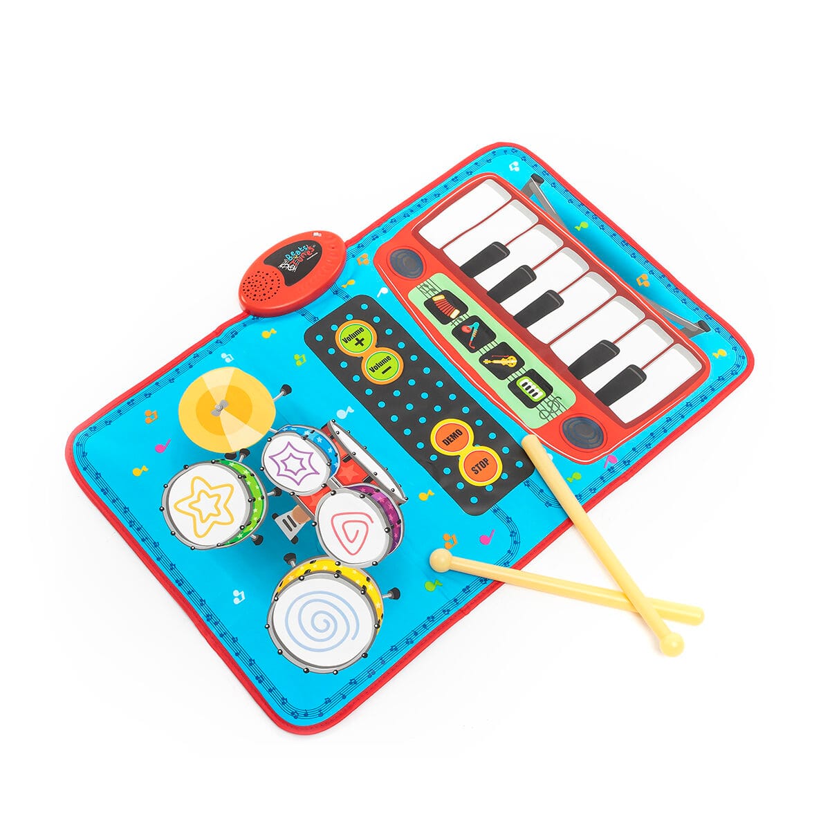 Un versatile tappeto musicale 2 in 1 con un originale design multicolore e multifunzionale che presenta una tastiera con 4 strumenti (pianoforte, violino, fisarmonica, sassofono) e una batteria con tamburi e piatti. Ha anche melodie di accompagnamento opzionali e include 2 bacchette per suonare la batteria. Ideale per far giocare 2 bambini, dato che la batteria e la tastiera possono essere suonate simultaneamente. Questo tappeto musicale è antiscivolo, resistente e molto facile da usare. Si accende e si spegne con il pulsante on/off. Il volume può essere regolato con i 2 pulsanti del volume (+/-). Le melodie di accompagnamento automatico possono essere attivate e disattivate con i pulsanti DEMO/STOP. Può essere posizionato su qualsiasi superficie (sul pavimento, su un tavolo, ecc.) e si può suonare con le mani o con i piedi. Funzionamento a batteria, leggero e portatile per un facile trasporto ovunque. Un regalo perfetto per introdurre i bambini all'arte della musica in modo divertente. Promuove lo sviluppo cognitivo migliorando l'osservazione, la memoria, l'immaginazione e il pensiero. Migliora le capacità interpersonali e l'equilibrio. Consigliato per bambini di età superiore ai 3 anni.