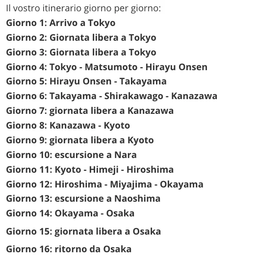 I pacchetti che trovate di seguito infatti, includono il volo con partenza da diversi aeroporti italiani, 16 giorni/15 notti con colazione inclusa, 2 transfer aeroporto-hotel, vari viaggi in autobus, JR West All Area Pass per 7 giorni, un'esperienza autentica con una cena tradizionale durante la tua notte in ryokan 😻